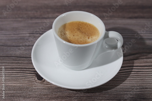 A white cup of espresso with its saucer on a wooden pattern.