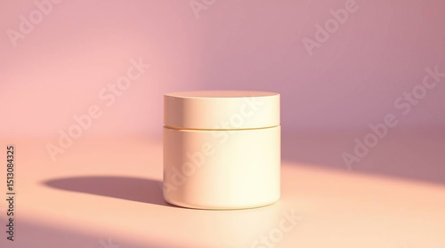 A white cylindrical container with a gold band sits on a pale pink surface bathed in warm sunlight, casting a long shadow