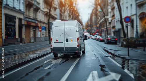 white, delivery, van, drive, city, street, reflect, soft, glow, morning, system, sunshine, ambience, modern, transport, driver, travel, wheel, cool, commerce, journey, business, sunlight, bustling, movement, shiny, service, roadway, landscape, background