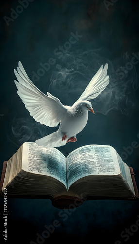 A white dove gracefully descending upon an open Bible, symbolizing the Holy Spirit and divine peace. -