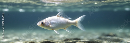 white, fish, swimming, water, clear, underwater, panorama, banner, copy, space, text, serene, peaceful, tranquil, nature, wildlife, aquatic, life, marin, ocean, lake, river, duck pond, sunlight, shadow, sandy, bottom, beautiful, vibrant, colourful, summer, spring, tropical, background, wallpaper