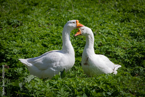 A white goose walks through the village close-up.