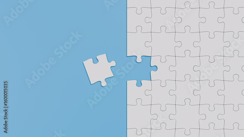 A White Jigsaw Laid on a Blue Background with a Missing Piece Moved Away, Vertical