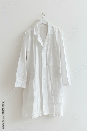 A white lab coat hangs neatly against a plain white background, symbolizing purity and professionalism.