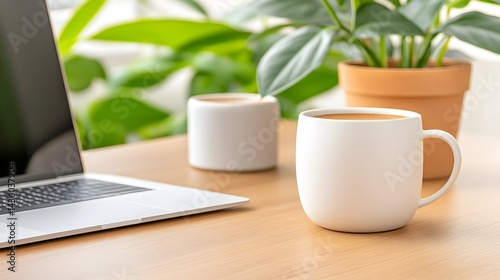 hot drink, mug, desk, laptop, plant, workspace, calm, peaceful, serene, office, home, work, study, morning, afternoon, beverage, drink, hot, warm, wooden, table, computer, technology, greenery, leaf, pot, terracotta, white, simple, minimalist, clean, organised, tidy, efficient, productive, comfortable, relaxing, cosy, inviting, natural, light, bright, airy, modern, stylish, aesthetic, background, scene, image