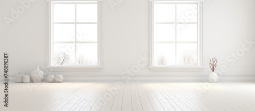 A white room with a clean and minimalist Scandinavian interior design. The room features two windows, allowing natural light to illuminate the space.