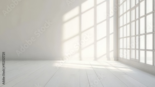 a white room with a large window and a door. There are shadows from the light coming through the window.