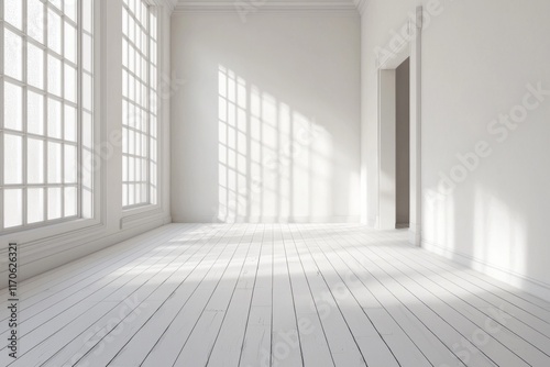 A white room with a white wooden floor, white walls, and a window on the left side.