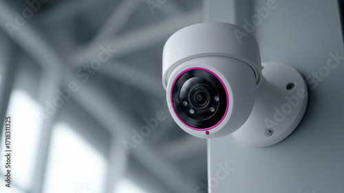 A white security camera with a pink accent ring is mounted, combining sleek modern design, surveillance functionality, and subtle style.