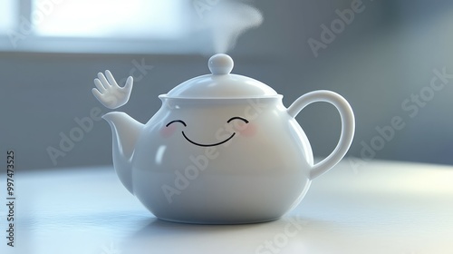 teapot, afternoon tea, tea, pottery, kitchen utensile, kitchen utensile, tea-party, hot drink, beverage, steam, wave, happy, smiling, cute, friendly, warm, inviting, white, table, window, kitchen, home, ceramic, porcelain, greeting card