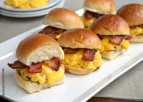 a white tray with a row of mini sandwiches. Each sandwich consists of a bun, a slice of bacon, and a scrambled egg. The sandwiches are placed on a white tray, and there are additional sandwiches in th