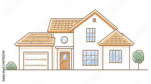 house, home, dwelling, residence, building, structure, architecture, design, exterior, facades, front, two-story, garage, door, window, circular, round, window, roof, gable, attic, chimney, siding, white, brown, beige, tan, orange, green, bush, tree, lawn, yard, landscaping, suburban, residential, modern, contemporary, minimalist, simple, clean, line, outline, illustration, vector, graphic, drawing, art, clip art