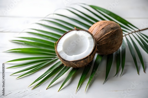 A whole coconut and a half coconut resting on a green palm leaf on a white wooden table