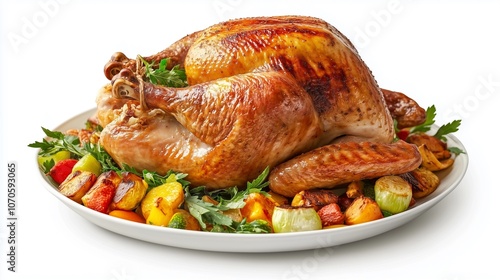 A Whole Golden-Brown Roasted Turkey with Colorful Vegetables on a Platter, Isolated on White Background