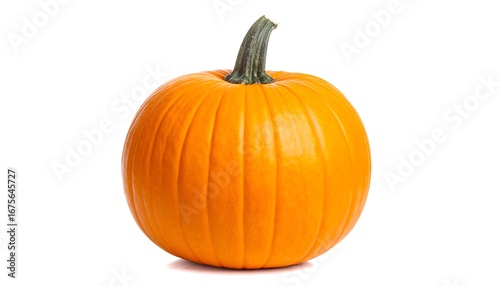 pumpkin, orange, whole, ripe, autumn, fall, gourd, vegetable, food, healthy, fresh, natural, produce, farming, organic, seasonal, harvest, display, studio, isolated, white, background, closeup, detail, ribbed, stem, round, bright, vibrant, smooth