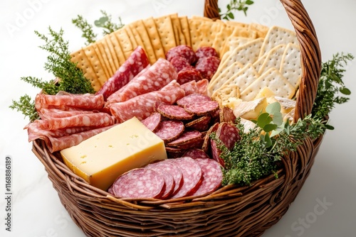 A wicker basket overflowing with salami, cheese, and crackers. Perfect for a gourmet appetizer or party platter, showcasing delicious cured meats and cheeses.