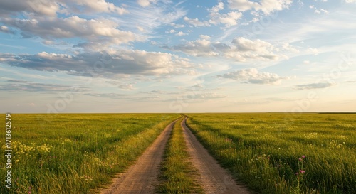 A wide, dirt road meanders through a vast, grassy field under a light, partly cloudy sky, creating a serene and peaceful landscape.