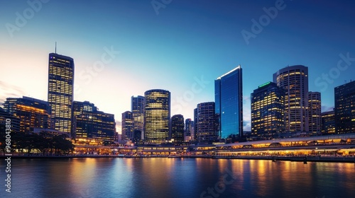 A wide horizontal shot of a modern city skyline at dusk, with illuminated buildings and a clear evening sky