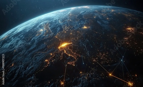 A wide shot of the Earth from space, with glowing city lights on its surface and interconnected lines representing global connectivity and data flow, against a dark background.