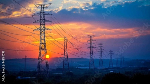 A wide-angle shot of a row of electrical power towers stretching into the distance, with a sunset casting a golden hue over the landscape.