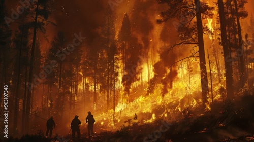 A wildfire spreading through a forest, with thick smoke filling the sky and firefighters working to contain the blaze.