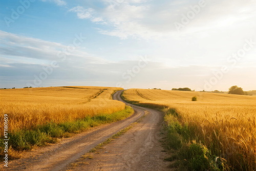 road, wheat, field, gold, sky, landscape, rural, countryside, nature, path, agriculture, sunlight, horizon, open, scenery, rural scene, country road, farmland, harvest, summer, daylight, meadow, grass, yellow, rural area, travel, exploration, adventure