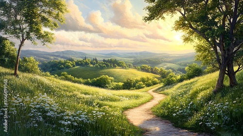 path, winding, vale, verdant, green, grass, hill, field, tree, sunlight, gold, sky, cloud, blue, white, sun, sunset, landscape, nature, scenic, beautiful, summer, meadow, flower, wildflower, foliage, horizon, bright, warm, peaceful, tranquil, serene