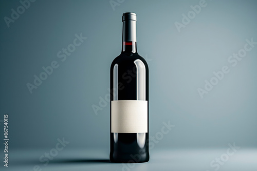 A wine bottle with a blank label on a soft light blue background, showcasing a mockup concept. Generative AI