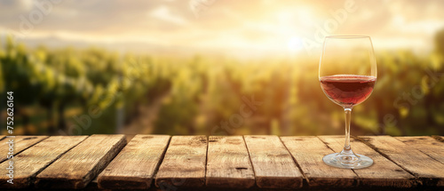 A wine glass over empty wooden table with blurred vineyard in the background. Generative AI.