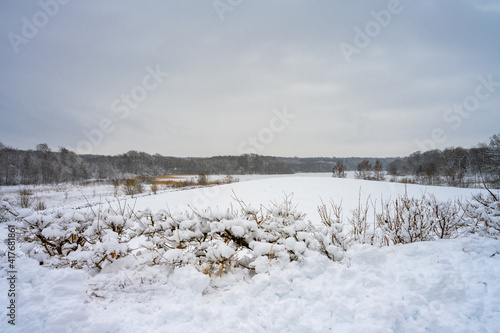 A winter landscape covered in snow on a crispy cold winter day. Picture from Scania county, Sweden