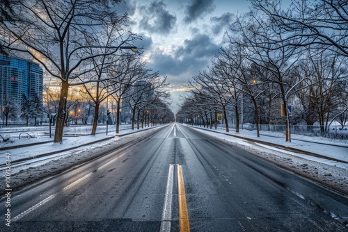 snow, street, tree, winter, landscape, scenery, white, frost, cold, season, festive, holiday, road, sidewalk, park, nature