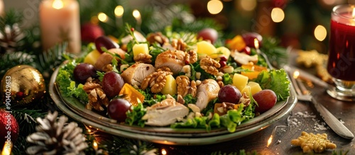 A winter themed Christmas salad featuring tasty ingredients like chicken cheese walnuts and grapes elegantly placed on a holiday table with room for text or visuals. . image with copy space