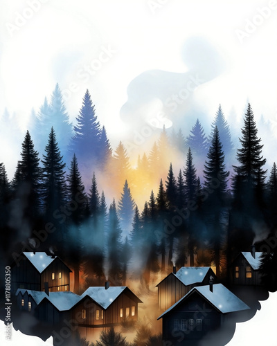 A winter traveler postcard with a small, quaint town nestled against the edge of a mystical forest at sunset, with frosted rooftops and cozy chimneys emitting light wisps of smoke