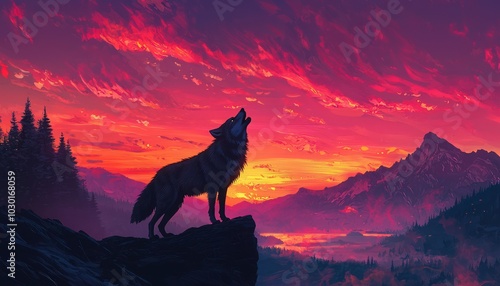 A wolf howling boldly against a backdrop a colorful sunset over a peaceful mountainous horizon.