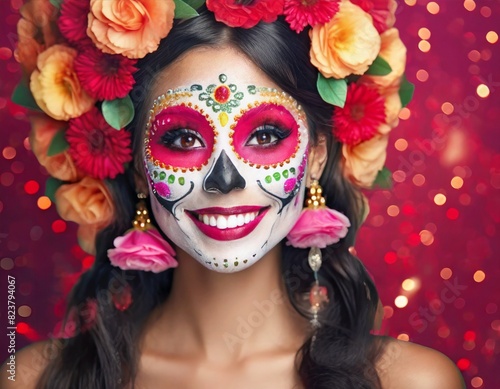 A woman adorned with vibrant makeup resembling a 'Day of the Dead' skull. She wears a floral headpiece made of roses and other flowers in shades of red, orange, and yellow.