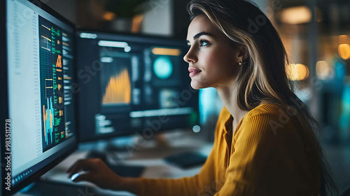 woman, work, office, business, technology, datum, analysis, chart, graph, computer, screen, professional, sharpened, concentration, monitor, desk, laptop, keyboard, mouse, analyst, businesswoman, success, digital, future, growth