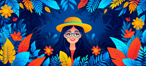 summer, fashion, style, woman, hat, sunglasses, vacation, tropics, flower, vivid colors, freshness, positive, relaxation, beauty, elegance, blonde hair, blue background, accessory, nature, portrait, fun, enjoyment, summer day, joy, happiness, model, flower, vector, illustration, fairy, autumn, people, hair, art, lady, face