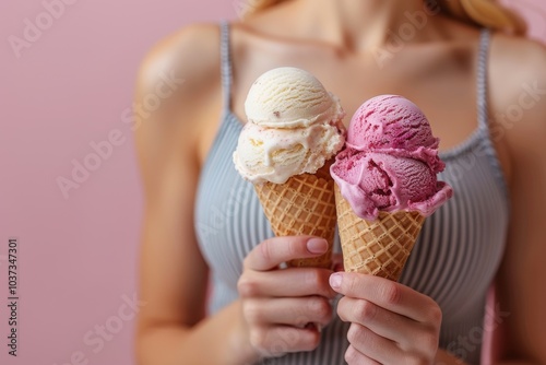 A woman enjoys two ice cream cones against a pastel pink backdrop