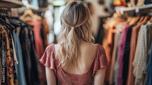 woman, clothing, store, shopping, fashion, vibrant, colourful, garment, retail, casual attire, style, boutique, apparel, trendy, accessory, clothes rack, life events, leisure, lifestyle, beauty, personal, exploration, consumer, market, hanging, selection, choice, female, casual clothes, portrait, backview, feminine, youth, colours, fabric, design, contemporary, chic, atmosphere, interior, modern, relaxed, enjoyment, ambience, discovery