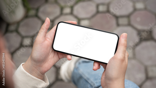 woman, sitting, outdoors, outside, asian, female, young, lifestyle, modern, casual attire, street, city, road, screen, display, blank, template, hand, holding, using, closeup, phone, communication, mobile phone, finger, copy space, empty, technology, connection, cyberspace, searching, shopping, photo, advertisement, app, application, horizontal, video, watching, game, playing