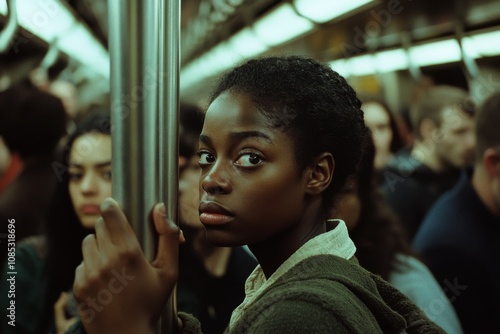 A woman holds a subway pole, her expression pensive, surrounded by a blurred crowd in a dimly lit subway cabin.