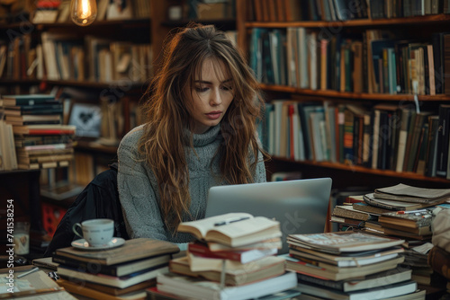 A woman immersed in her work surrounded by stacks of books a laptop and a cup of coffee in a cozy home office.