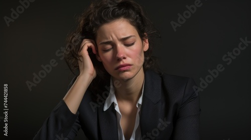 A woman in a black blazer suffering from a painful headache or migraine, hand on her head. Generative ai