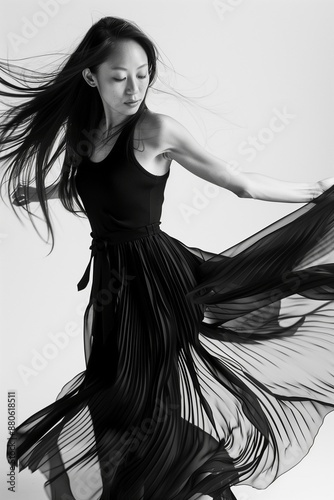 A woman in a black dress is dancing with her hair blowing in the wind