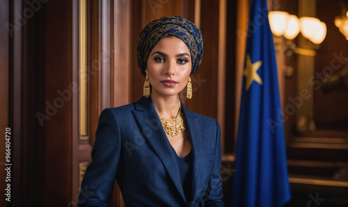 woman, blue, suit, headscarf, flag, star, office, wooden, paneling, racked, look, camera, arms crossed, blazer, setting, professional, formal, business, politician, leader, confidence, strong, powerful, elegant, fashion, style, portrait, background, government, building, institution, interior, decor, furniture, decoration, light, shadow, sharpened, composition, colours