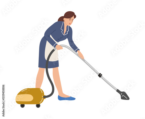 woman, blue, uniform, cleaning, floor, vacuum, vector, illustration, isolated, white, background, cleaner, housework, housekeeping, home, house, female, work, service, hotel, person, domestic, character, maid, men at work, equipment, homemaker, hygiene, professional, lady, occupation, flat, household, cartoon, dust, housemaid, cute, apron, chore, indoor, tool, business, room, profession, cleanup, labor, concierge, dirty, carpet