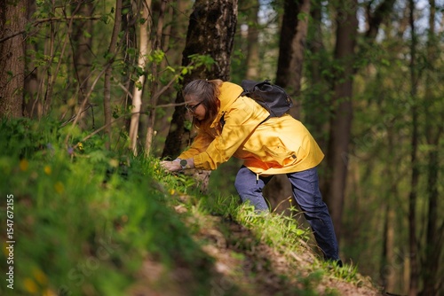 nature, forest, wildflower, hiking, woman, yellow jacket, collecting, greenery, sunny, trail, exploration, calmness, spring, leisure, flora, beauty, backpack, plant, closeup, environment, landscape, wildlife, casual attire, fresh air, activity, shrub, sunlight, serene, foliage, growth, hobby, peaceful, environmentally friendly, enjoyment, blossom, vivid colors, natural beauty, earth-tone, adventure, discovery, sunshine, harmony, gardening