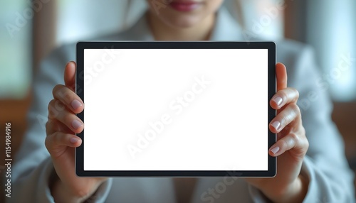 A woman in a business suit, identified as a lawyer, displays a tablet with a blank screen, poised for a presentation