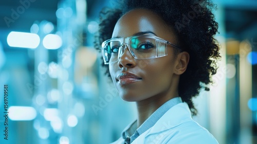 woman, scientist, scientific, equipment, experiment, discovery, safety, laboratory, coat, blue, light, laboratory, curly, hair, research, environment, wearing, goggles, standing, light, background
