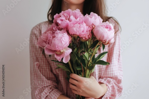A woman in a pink checkered shirt holds a fresh bouquet of pink peonies close to her chest against a light background